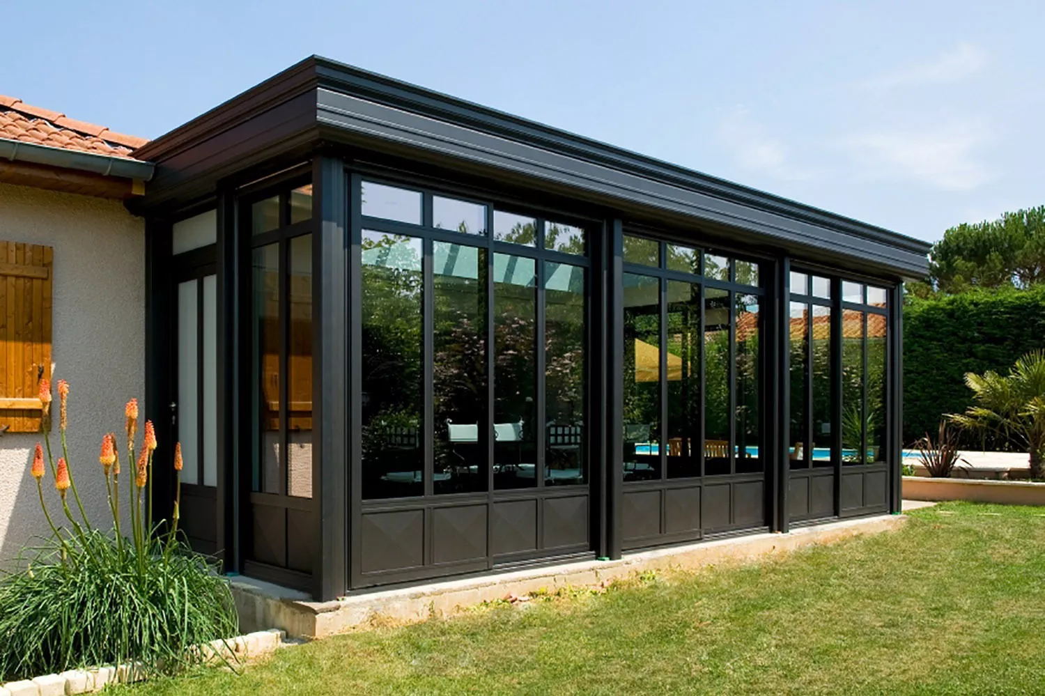 La Villanda® se distingue par ses vastes surfaces vitrées, offrant une vue panoramique imprenable sur votre jardin. Cette conception unique permet de créer une transition harmonieuse entre l’intérieur et l’extérieur, inondant votre espace de lumière naturelle et vous permettant de profiter pleinement du paysage tout au long de l’année. Que ce soit pour un moment de détente ou pour recevoir des invités, la vue panoramique de la Villanda® ajoute une dimension exceptionnelle à votre espace de vie.